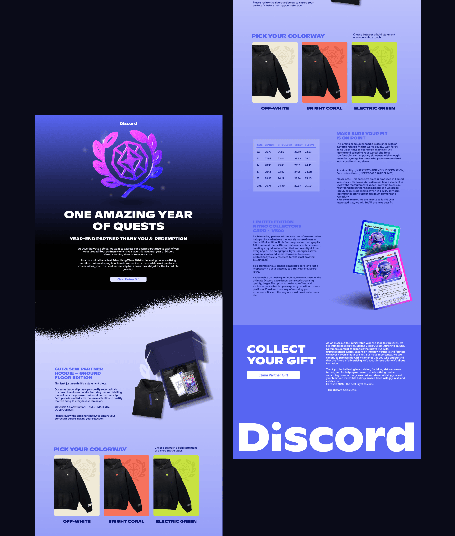 This year, I got the privilege of working with discord on one of their end of year gifting initiatives. Together, we created a high-end hoodie with custom tags and labels that helped highlight their achievements. The collection included a custom garment bag, paper tags, a letter, stickers and a limited edition playing card.